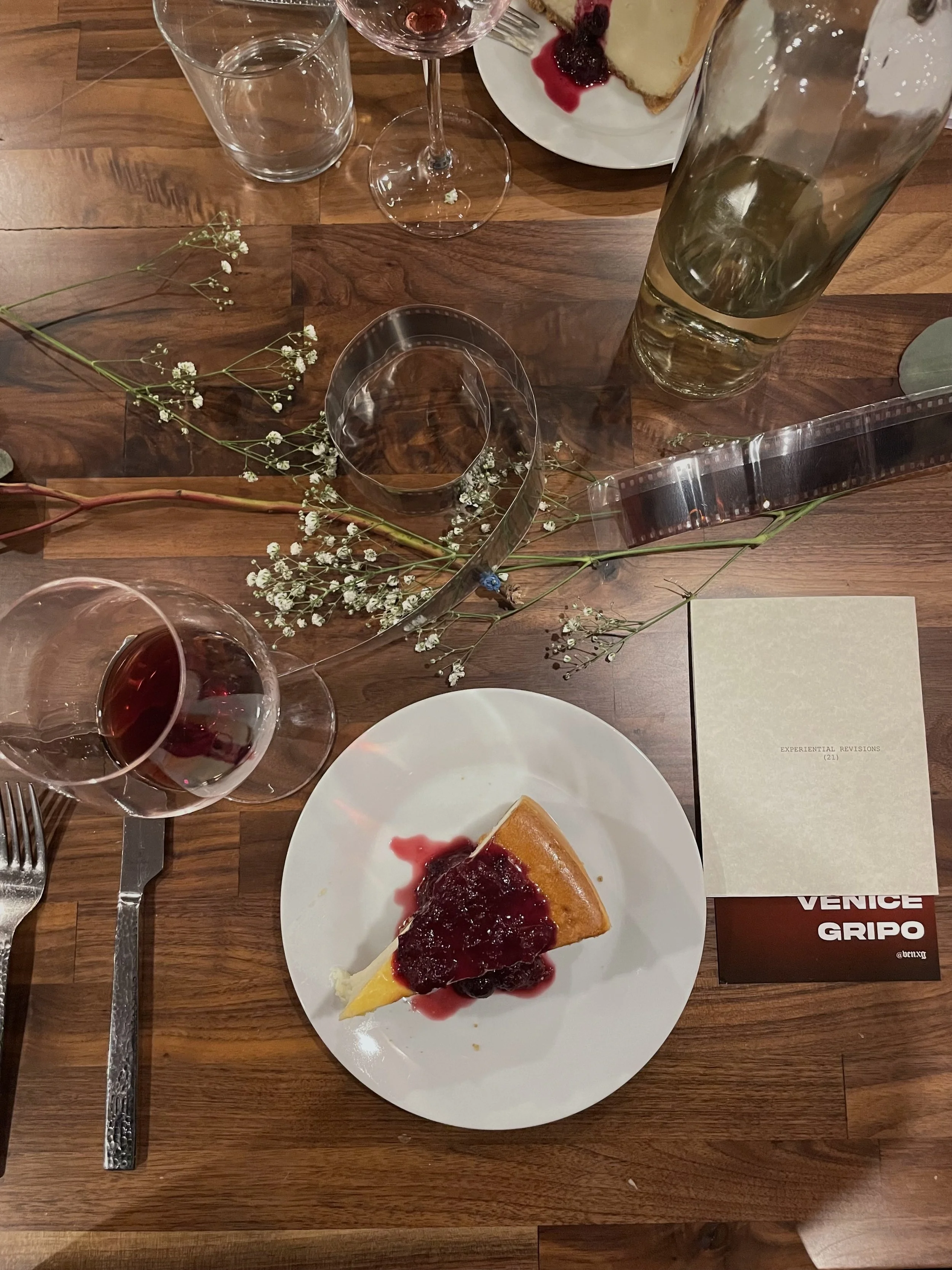 Meet Me at the Director’s Table, a private dinner party of 32 attendees celebrating the 21st age of Nicole Irene M Condez. Themed “Director’s Table,” the event commemorates the host’s passions for film, photography, and the interdisciplinary arts. Pinot Grigio-red roses and invitation cards line the dining arrangements among an array of used film negatives intertwined with fresh centerpiece foliage. The guests are greeted at their seats with a personalized written statement from the host, a charcuterie & wine pairing, and finally a four-course dinner. Disposable film cameras lay ready to use for guests to chronicle the event at their own candid discretion.